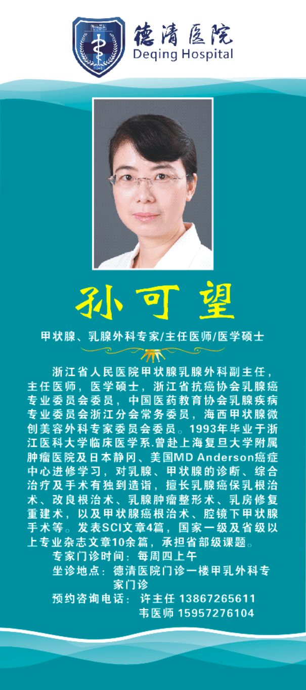 5月11日起,每周四上午我院特邀到浙江省人民医院甲状腺乳腺外科孙可望、雷科锋两位专家到我院专家坐诊,请广大患者相互转告,欢迎前来就诊!