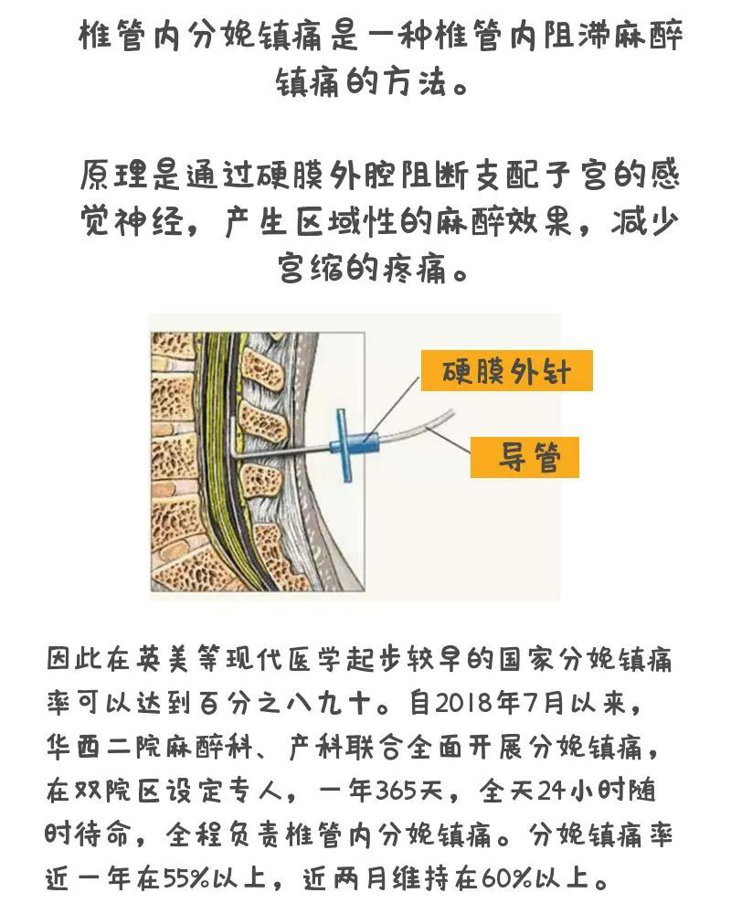 这就是椎管内分娩镇痛,它所需要的药物浓度低,镇痛效果好,可控性强,是目前世界上公认的最安全有效的镇痛方法。