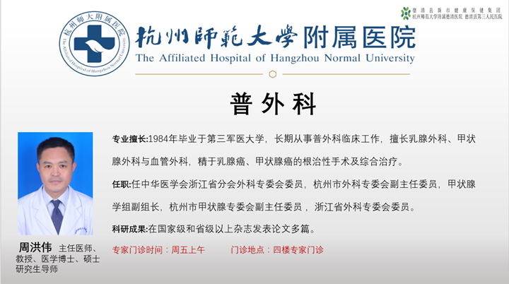 丰富的理论知识和精湛的临床技术,源自于周洪伟教授日积月累的厚积薄发。1984年,毕业于第三军医大学,长期从事普外科临床工作,擅长乳腺外科、甲状腺外科与血管外科,精于乳腺癌、甲状腺癌的根治性手术及综合治疗。